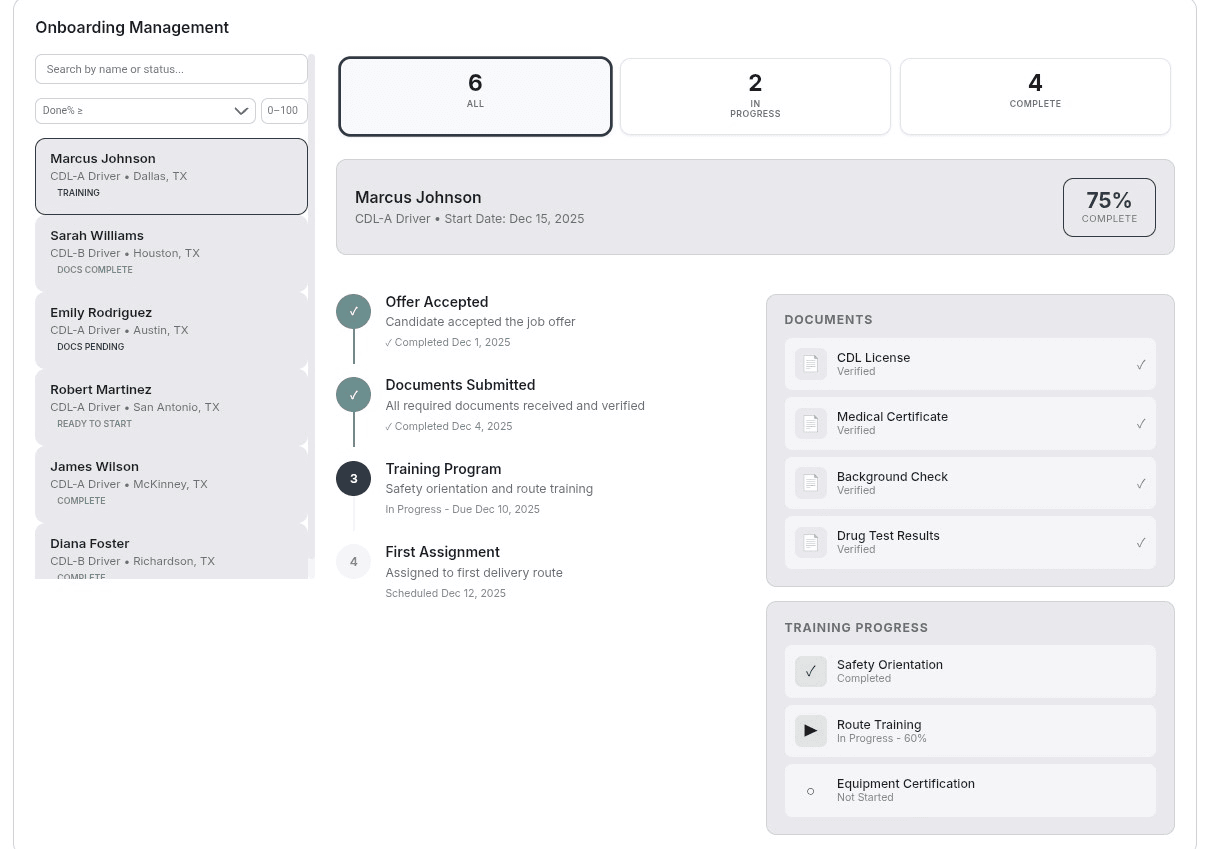 The Recruiter’s Action Dashboard ends the productivity-killing cycle of switching between disconnected spreadsheets, email threads, and third-party safety databases. By unifying candidate communication, AI-video summaries, and real-world safety and maintenance records into a single, intuitive interface, your team can manage the entire hiring lifecycle from one screen. This centralized visibility ensures that every recruiter knows exactly which high-priority tasks to tackle next, allowing you to move drivers through the pipeline with surgical precision and eliminate the administrative friction that typically stalls fleet growth.